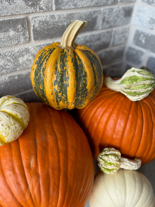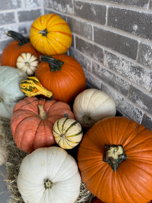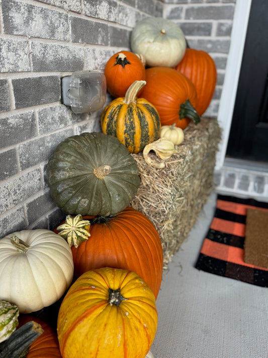 For Fall our packages include fresh pumpkins, gourds and hay bales.